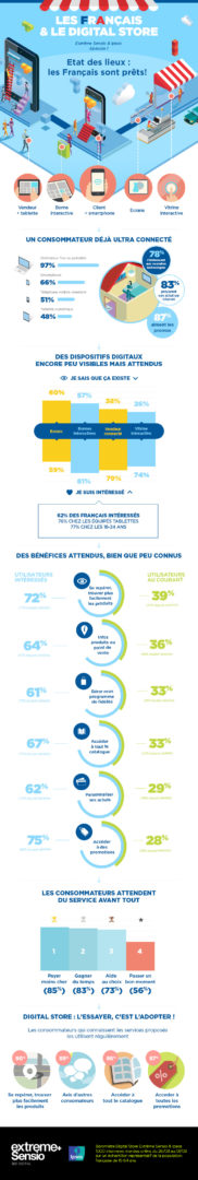 Le « magasin connecté » est en effet un enjeu fondamental de reconquête des clients pour les enseignes, confrontées à une croissance rapide l’e-commerce. Cette infographie met en lumière les attentes des Français au sujet des expériences et des services connectés en points de vente.